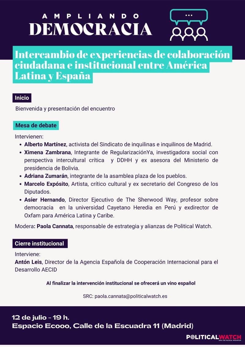 Political Watch, a través de Ampliando Democracia, organiza este debate en el que intervendrán expertos y expertas con una dilatada experiencia y conocimiento sobre los temas a abordar.